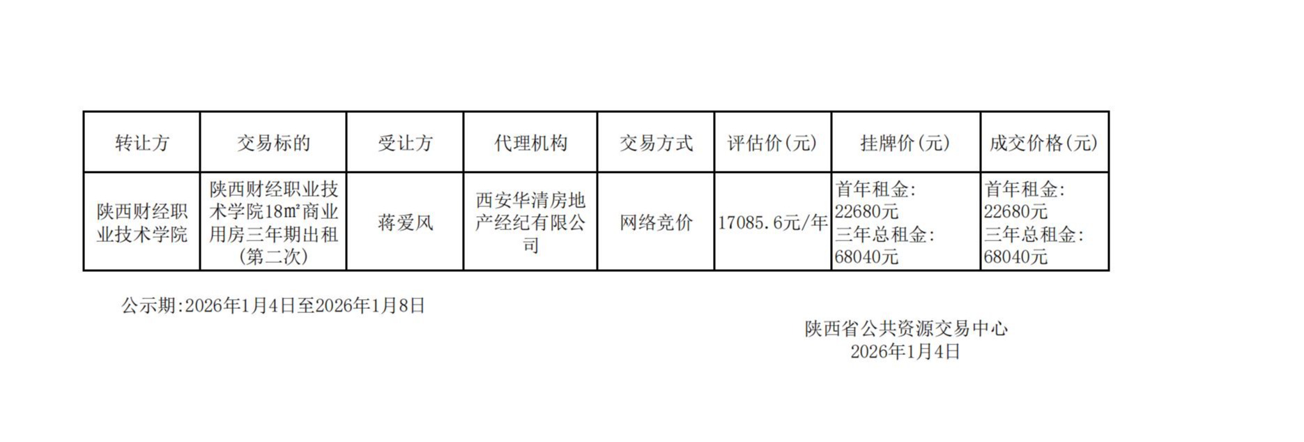 陕西财经职业技术学院18㎡商业用房三年期出租(第二次)成交公告